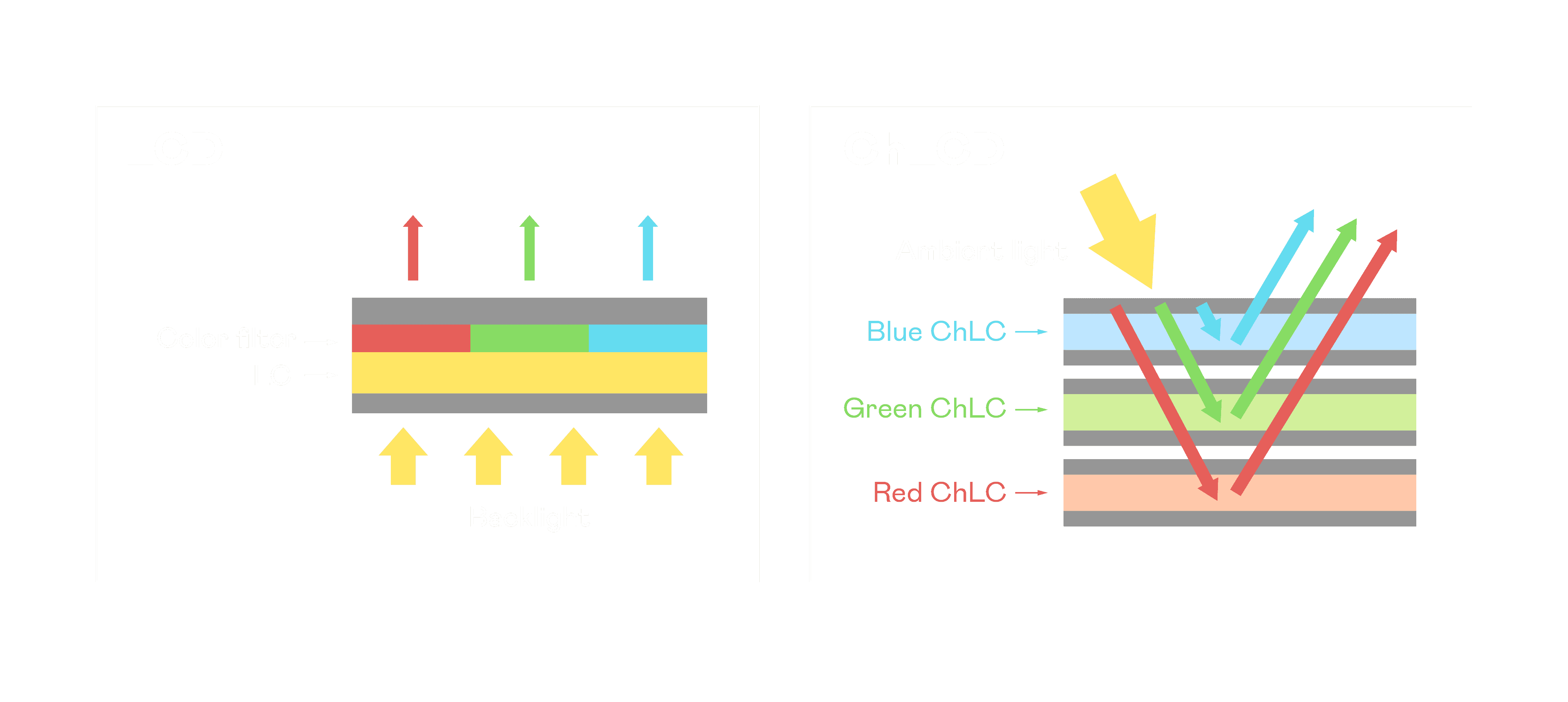 ChLCD 胆固醇液晶就如同纸张一样,,,透过反射环境光来显示影像,,因此长时间观看不易造成人眼视觉疲劳,,,,可达到护眼效果。。当处于户外阳光下使用,,,,LCD 影像容易失真而不易观看,,,但胆固醇液晶仍可维持较佳的影像品质。。