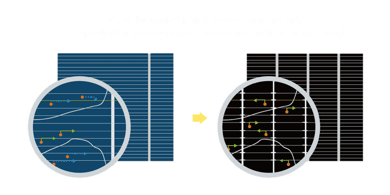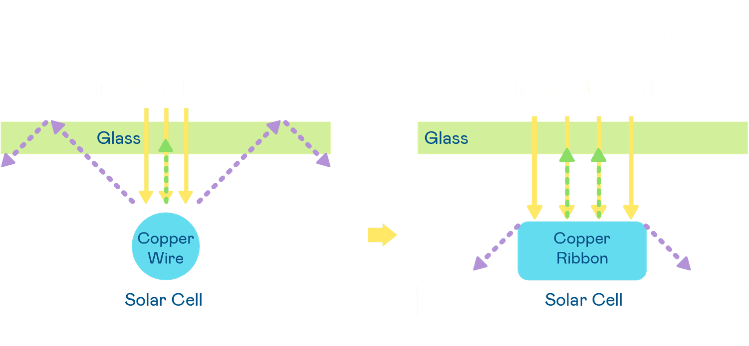 • 电池使用多条铜导线 (Copper wire) 于电池片上形成较短的电流路径,,,,提高电流收集效率,,采用圆形设计的铜导线较传统扁平式的铜焊带 (Ribbon),,,可增加入射至电池的光线量。。。
