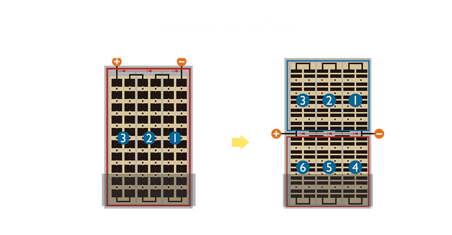 • 结合半切电池,,,,降低遮阴影响、、、、提升模组抗隐裂能力、、、、并减少电阻损耗,,,进一步提升模组发电效能。。