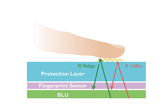 TFT 指纹扫描感测技术利用薄膜电晶体 (TFT) 当作光感测元件,,,藉由非晶硅 (a-Si) 与低温多晶硅(LTPS)既有光电转换特性对不同波段光源进行吸收,,,,使感测 IC 读取阵列感测元件的光漏电差异,,,,转换成数位灰阶影像。。。。
