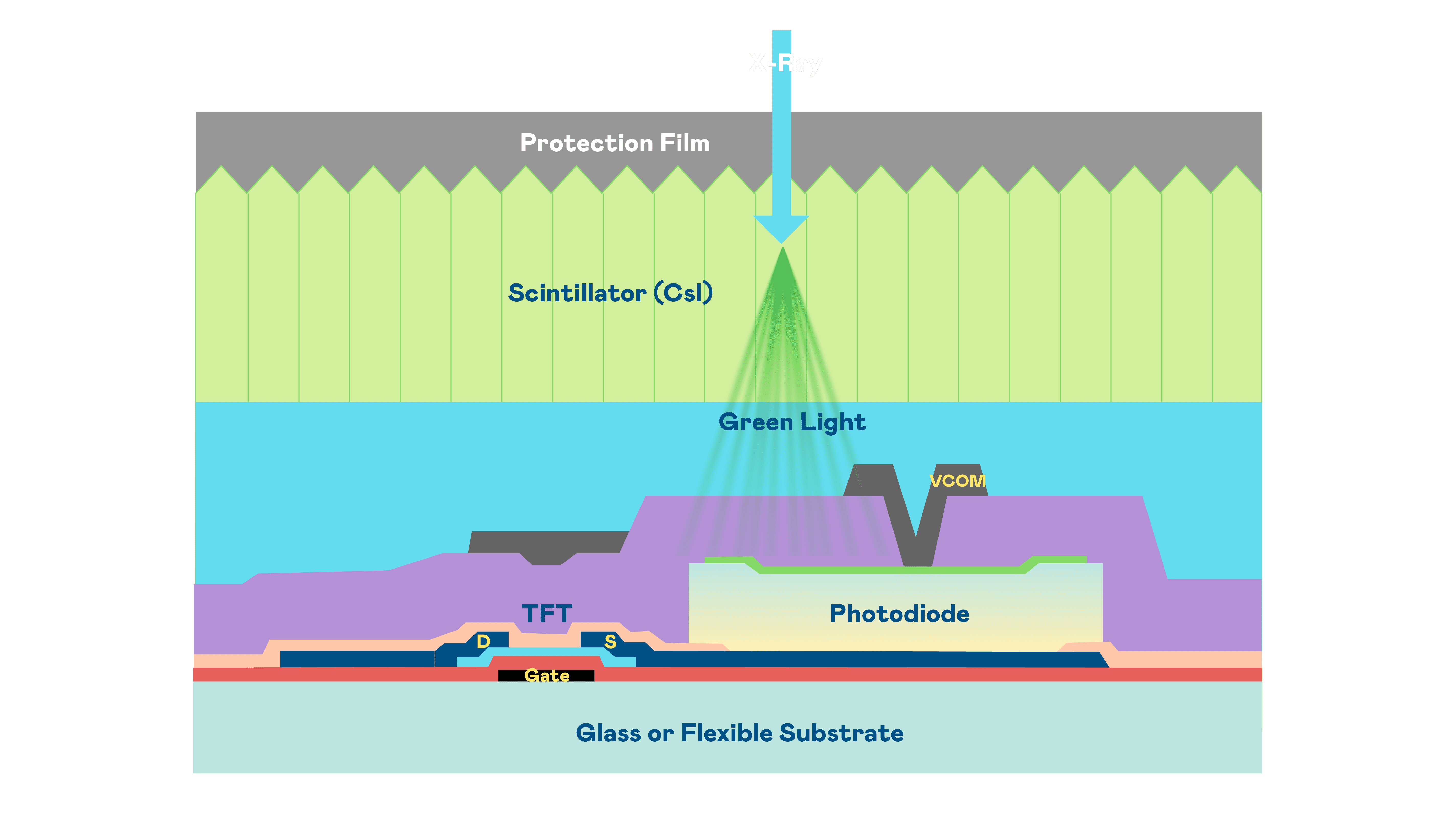 银河集团的X光影像感测阵列使用薄膜电晶体 (TFT) 作为每个像素的读取开关,,,,搭配光电二极体(Photodiode)的光电转换元件,,用以感测X光影像讯号。。。